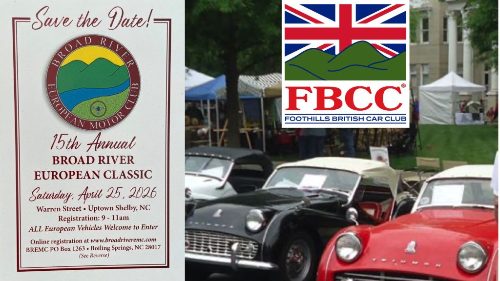 The Broad River Classic put on by the Broad River European Motor Club returns to downtown Shelby, NC! We will organize a drive out there and watch for more details to come. Show starts at 9 AM so we will likely leave Jud’s Brown Building around 7:30.