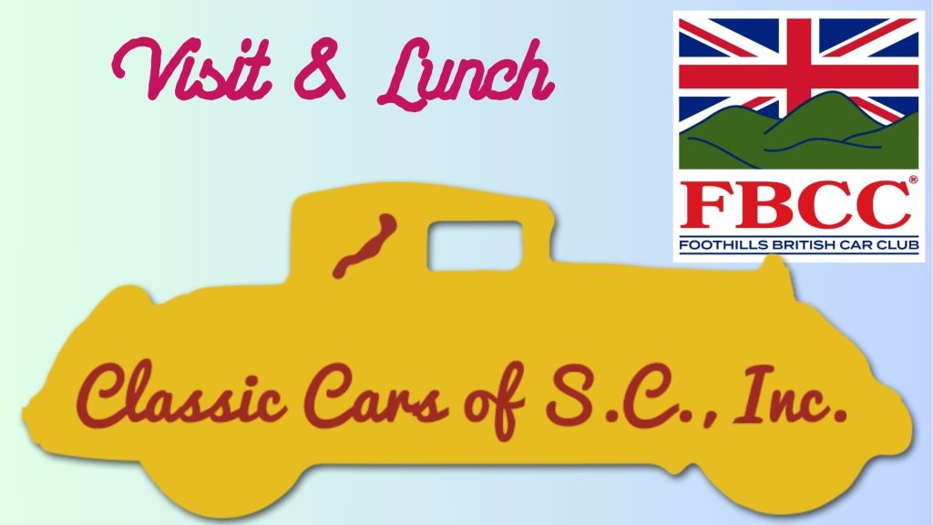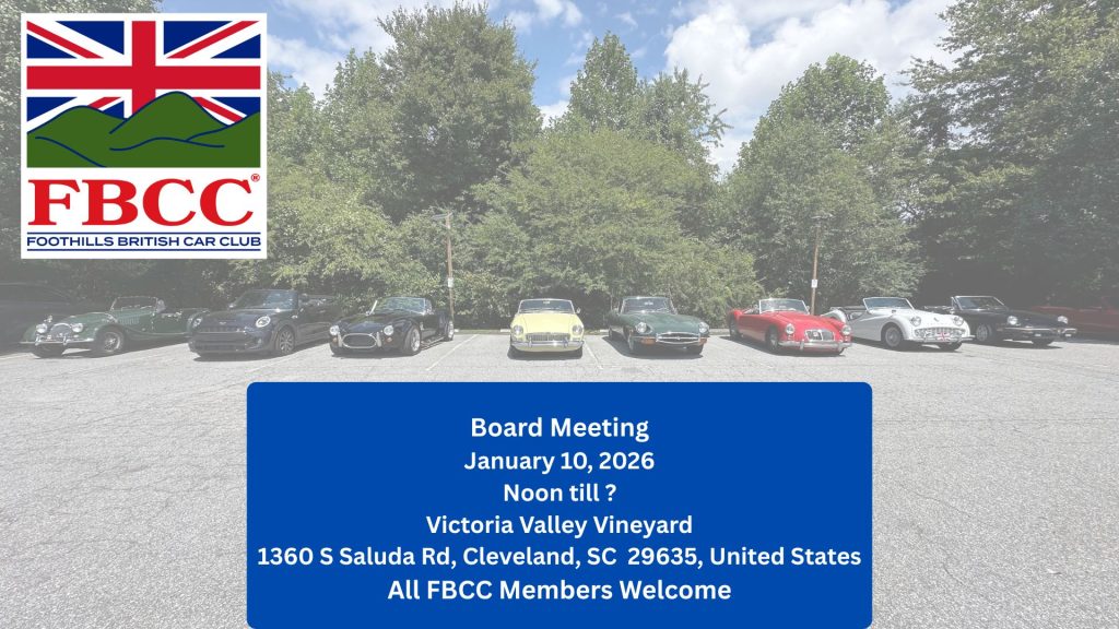 The FBCC Inaugural FBCC Time, Distance, Speed (TSD) Rally. It will start from Jud’s Brown Building with a driver’s meeting at 9:30. We will end at Stubborn Mule Brewery in Landrum for lunch and a recap around 1 PM. This is being put on by FBCC member Carl Baker. Watch for more details but reserve the date. Open to all British Car Clubs