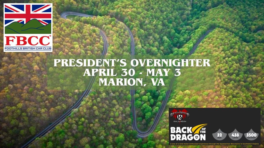Our annual President’s Overnighter this year will be centered out of Marion, VA which is one end of the Back Of The Dragon. Great drives, fellowship, food and FBCC fun are all on tap.