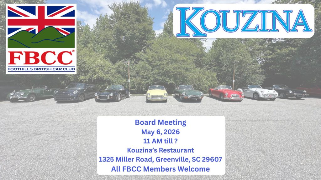 The FBCC Inaugural FBCC Time, Distance, Speed (TSD) Rally. It will start from Jud’s Brown Building with a driver’s meeting at 9:30. We will end at Stubborn Mule Brewery in Landrum for lunch and a recap around 1 PM. This is being put on by FBCC member Carl Baker. Watch for more details but reserve the date. Open to all British Car Clubs