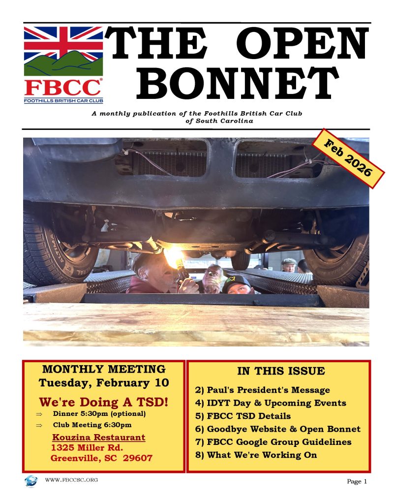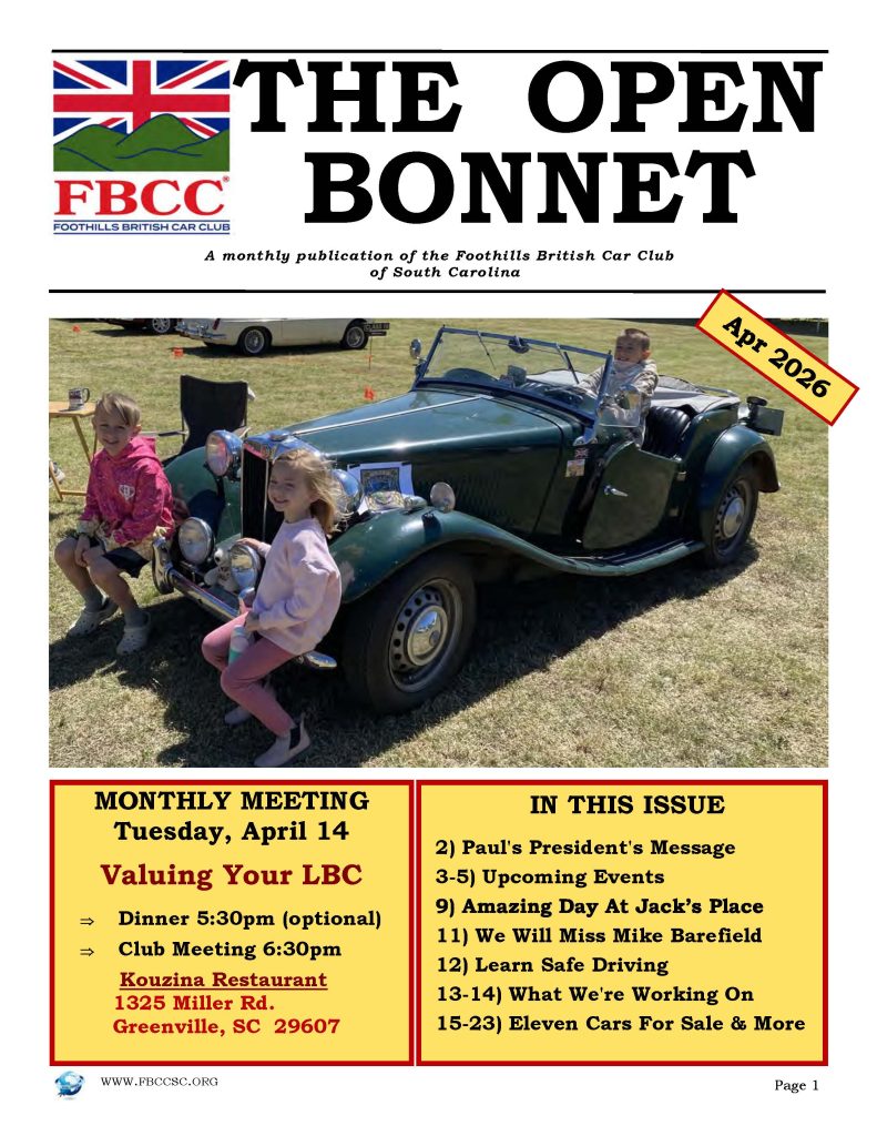 The Open Bonnet is our place for news, tech tips, sharing photos, stuff for sale and more. Below is our current issues. All back issues are in the members only area of our website.