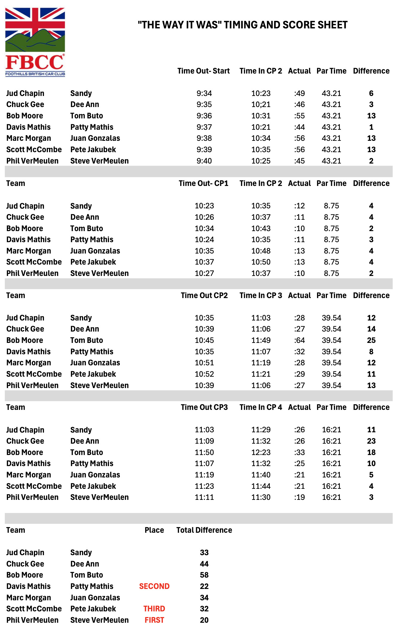 On April 11, 2026, the FBCC will be hosting an old-fashioned Time Speed Distance road rally, think 1966, but adjusted for a 2026 reality. This event will combine a good drive in the country, with the scoring (TIME) at the checkpoints to the minute, not second as it was. (SPEED) as the rally instructions for average speed will be the same, or sometimes slower, than the posted speed limit. (DISTANCE) approximately 60 miles. Of course that depends on how often you miss a turn.